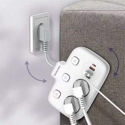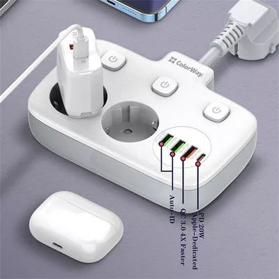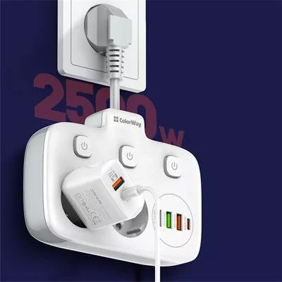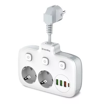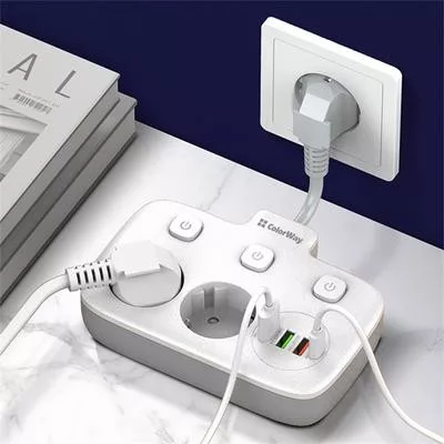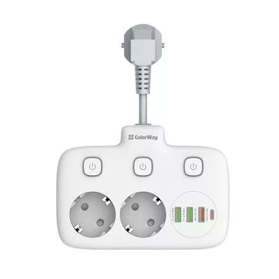 Compact extension cord with 2 mains sockets 220V, equipped with protective curtains using Child Security Door technology. 3 USB ports, 1 of which supports Quick Charge 3.0 fast charging technology, and 1 USB-C PD with Apple fast charging support. Sockets and USB outputs are equipped with a convenient on and off button. With its help, you can connect not only electrical appliances, but also simultaneously charge up to four mobile devices: smartphones, tablets, external batteries and many other devices that support charging from USB and USB-C PD. Contact groups of sockets are made of high-quality copper alloy. The body is made of heat-resistant plastic that can withstand temperatures up to 850C °. There is grounding and overvoltage protection. The short power cable does not get tangled, and its high strength allows the extension cord to hang against the wall at the connection point.