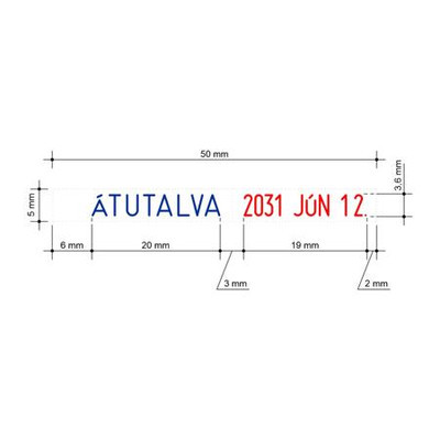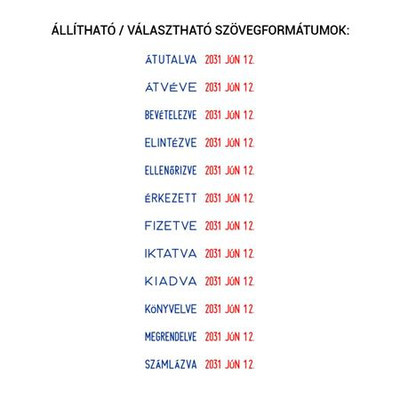 - azonnali használatra kész dátumbélyegző a leggyakrabban használt irodai szavakkal - év/hónap/nap dátumformátummal - az évszalag 12 évig használható - a szöveg kék, a keltezés piros színben jelenik meg - karaktermagasság: 3,6 mm - S120 WD választható szövegek: ÁTUTALVA, ÁTVÉVE, BEVÉTELEZVE, ELINTÉZVE, ELLENŐRIZVE, ÉRKEZETT, FIZETVE, IKTATVA, KIADVA, KÖNYVELVE, MEGRENDELVE, SZÁMLÁZVA Cserepárnája: E12, E12/2 Gyártó/első EU forgalmazó elérhetősége: COLOP Stempelerzeugung Skopek GmbH&Co.KG 4600 Wels, Dr.-Arming-Straße 5, Ausztria colop@colop.com www.colop.com