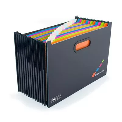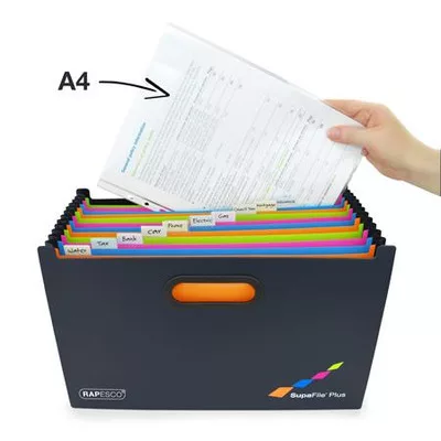 Rendezze rendszeresen papírjait Rapesco SupaFile segítségével-rekeszenként körülbelül 115 lap tárolására alkalmas (80 gr-os papír esetén)-feliratozható rekeszek és névjegykártyatartó-merev, tartós fogantyúk a könnyű szállításhoz-méret: 329 mm x 260 mm (teljesen kinyitva) x 258 mmGyártó/első EU forgalmazó elérhetősége: Rapesco-Tacwise BVKraijenhoffstraat, 137A, 1018RG Amsterdam, Netherlandssupport@rapesco-tacwise.nlwww.rapesco.com