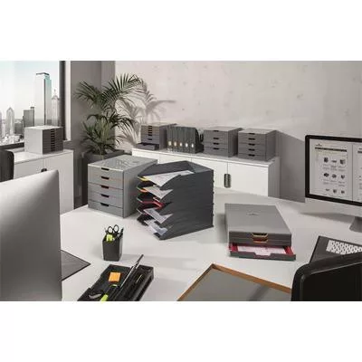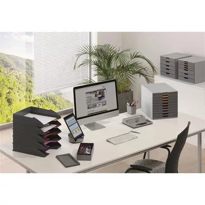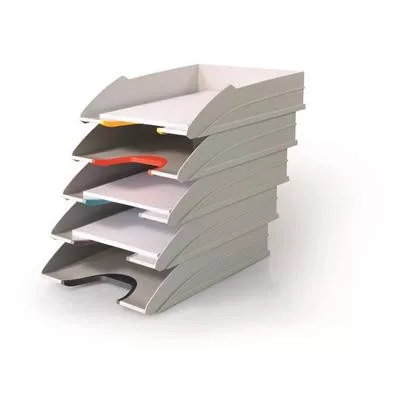 5 db elegáns irattálcát tartalmazó szett színes kivágással, mely megkönnyíti az iratok közötti keresést.