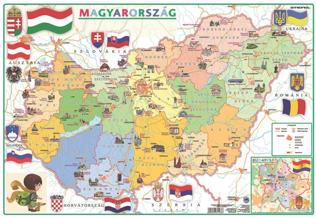 A legkisebbeknek készült az új kétoldalas Magyarország térkép, mely csak az alsó tagozatosok számára szükséges információkat tartalmazza. A Magyarország közigazgatását ábrázoló térkép a megyék és a fontos nagyvárosok feltüntetése mellett, a jellegzetes épületek rajzaival megismerésre ösztönzi a gyermekeket vagy emlékezteti őket a családi kirándulásokon látott szépségekre. Az alátét hátoldalán Magyarország színes vaktérképe látható, így kikérdezhetők az előoldalon látottak.