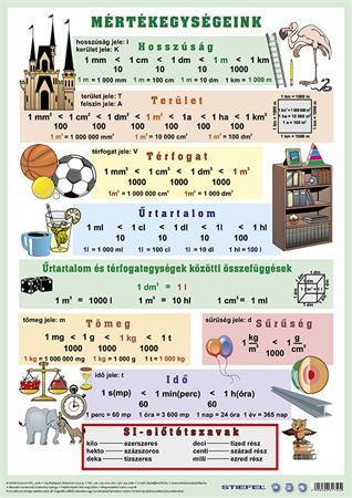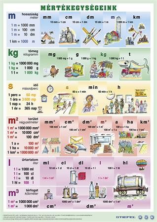 A mértékegységek áttekintése szemléletes rajzokkal, amelyek segítenek a tanultak rögzülésében. Hátoldalán gyakorló oldallal
