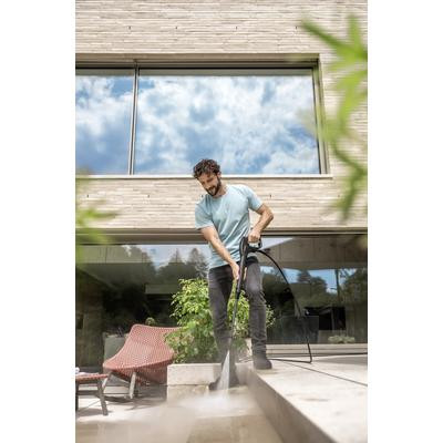 A Quick Connect csatlakozásnak köszönhetően a magasnyomású tömlő könnyen bepattintható és kioldható a készülékből és a pisztolyból. A 10 m-es tömlő nagy mozgásteret ad, a nagy kerekek pedig megkönnyítik a gép mozgatását egyenetlen felületeken, kerti utakon, felhajtókon is.