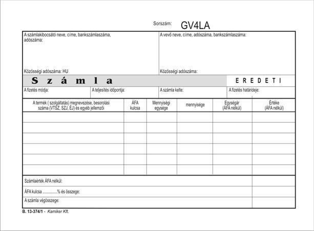 Nyomtatvány, számlatömb, egy ÁFÁs, 50x3, A5, fekvő, VICTORIA PAPER, "B.13-374", 10 tömb/csomag