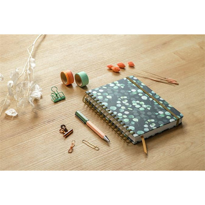 Eukaliptusz motívumos keményfedeles spirálfüzet-matt motívum-zöld spirálkötés-mikroperforált lapok-240 pontrácsos oldal-120 grammos fehér papír-zseb a hátsó borítóján-70 %-ban FSC tanusítvánnyal rendelkező alapanyagból-vegán termékGyártó/első EU forgalmazó elérhetősége: SIGEL GmbHBaeumenheimer Strasse 10, 86690 Mertingen, Germanysandra.geist@sigel.dewww.sigel-office.com