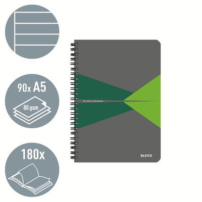 Spirálfüzet, A5, vonalas, 90 lap, laminált karton borító, LEITZ "Office", szürke-zöld