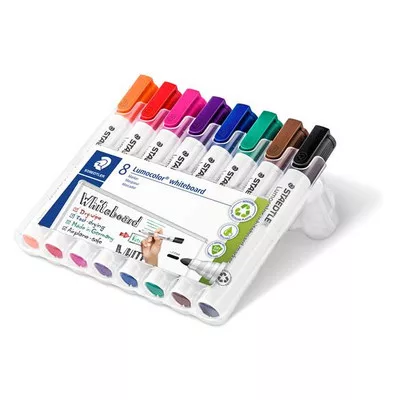 A STAEDTLER táblamarkerek különösen hasznosak előadásokhoz és prezentációkhoz, valamint kiválóan alkalmasak rajzolásra és jegyzetelésre az irodai brainstorming során. Mindenekelőtt fehér táblákon, speciálisan bevonatú táblákon és sima felületeken való használatra tervezték őket.